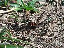 Das dorsal hell- bis dunkelbraun gefärbte Opisthosoma (Hinterleib) wird durch zwei längslaufende Linien, die aus schwachen Pünktchen gebildet werden, ausgezeichnet. Am hinteren Rand dieser Linien sind bei einigen Individuen schwarze Punkte ausgebildet. Die Unterseite ist einheitlich und je nach Geschlecht von orange über braun bis schwarz gefärbt.[5] Auch hierbei handelt es sich um eine Warnfärbung, die bei der Drohgebärde zum Einsatz kommt.