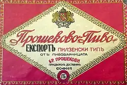 - Bilder einer Bierflasche der Brauerei Prošek, Flasche um 1900; in Glas geprägte Aufschrift: БР. ПРОШЕКОВИ – СОФИЯ (БР. = Братя), придворен доставчик; deutsch: Gebrüder Proschek – Sofia, Hoflieferant