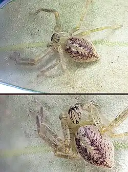 Das Prosoma (Vorderkörper) erscheint rotbraun bis gelblich, während die Cheliceren (Kieferklauen) rotbraun und distal (vom Zentrum entfernt gelegen) dunkler gefärbt sind. Die Färbung der Beine ist gelblich bis bräunlich. Sie sind außerdem dunkel gefleckt und erscheinen distal ebenfalls etwas dunkler. An den Coxen (Hüftglieder) sind die Beine leicht seitlich eingedreht.[2]