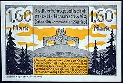 Die Braunschweigische Staatsbank gab, wie auch ca. 6000[2] deutsche Städte, Gemeinden, Kreise, Provinzen, diverse Handelskammern, die Reichsbahn, aber auch Privatunternehmen Papiergeld in Form von Kleingeldscheinen mit Nennwerten von 10, 25, 50 und 75 Pfennigen heraus. Neben der Stadt Braunschweig gaben auch (ehemals zum Herzogtum Braunschweig gehörende) Städte wie z. B. Wolfenbüttel, Holzminden (am 9. November 1918) oder Stadtoldendorf (am 21. November 1918) Notgeld aus.[4] Am 1. Mai 1921 gab die Braunschweigische Staatsbank vier Serien mit einer Laufzeit bis 1. Mai 1923 heraus. Diese Notgeldscheine mit den Werten 10, 25, 50 und 70 Pfennig waren deutlich kleiner als die staatlichen Banknoten und von lokalen Künstlern gestaltet, die lokal(historisch)e Begebenheiten und Personen abbildeten.[1] Auf den Rückseiten der Scheine wurden Szenen von „Till Eulenspiegel“ bzw. aus „Blankenburg im Harz“, „Bad Harzburg“ und „Alt-Braunschweig“ dargestellt.