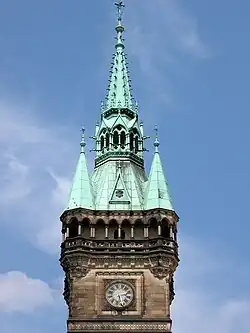 An der Südwestecke des Rathauses befindet sich der 61 Meter hohe fünfspitzige Rathausturm. Da die Baukosten schon bald die Planung erheblich überschritten, wurde 1893/94 darüber beraten, nachträglich und entgegen der ursprünglichen Planung auf den Bau des Turmes zu verzichten. Da jedoch die Fundamente bereits angelegt waren, baute man ihn schließlich doch.