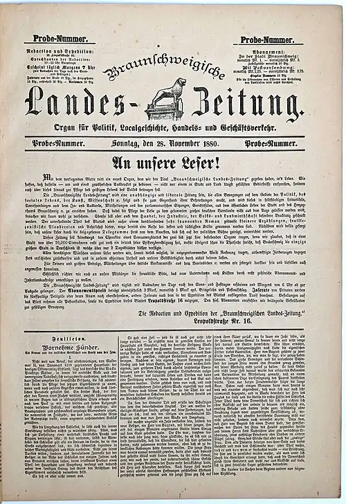 Die Probenummer der Braunschweigische Landeszeitung kam am 28. November 1880 heraus.[2] Die Zeitung erschien anfänglich zweimal, später einmal täglich.[3] Im Zentrum des Zeitungskopfes befand sich der Braunschweiger Löwe, Der Untertitel lautete: „Organ für Politik, Localgeschichte [sic!], Handels- und Geschäftsverkehr“.[4] Die Zeitung wurde im Verlag von Albert Limbach herausgebracht, ihre politische Ausrichtung wurde im Gründungsaufruf mit „liberal“ angegeben.[2] Sehr bald schon stellte sich jedoch heraus, dass das Blatt, das im Herzogtum Braunschweig und nach dem Ersten Weltkrieg im Freistaat Braunschweig eine beherrschende Stellung einnahm, eher nationalliberal und konservativ in der Ausrichtung war. Ab 1890 galt das Blatt als inoffizielles Organ der Nationalliberalen Partei. Der Erfolg der Braunschweigischen Landeszeitung zeigte sich unter anderem daran, dass das Blatt 1897 den innerstädtischen Rivalen, das Braunschweiger Tageblatt aufgekauft hatte.[2]