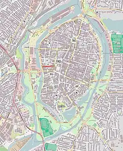 - Braunstraße 1–5, Gebäude der Reichspost mit integriertem Sandsteinportal der Renaissance des Bildhauers Robert Coppens aus dem Jahr 1587. Darin Rokoko-Haustür von der Mitte des 18. Jahrhunderts. Das Portal wurde vom ehemaligen Schütting (Amtshaus) der Krämerkompagnie in Lübeck, Schüsselbuden 24, beim Abbruch des Hauses 1904 geborgen und in das 1905–1909 errichtete neugotische Paketpostgebäude der Reichspost übernommen.[1]
