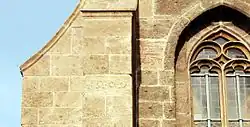 Ein weißer und ein schwarzer Treppenturm markieren die Grenze zwischen dem ehemaligen Westabschluss der romanischen Kirche und dem Westbaues. Der niedrigere weiße Treppenturm gehört noch zum ursprünglichen Westbau. Der massive schwarze Treppenturm wird dem Anfang eines Westbaues zugerechnet, dessen Planung geändert wurde. In ihn ist die erneuerte Jahreszahl 1485 eingemeißelt. Am Ende der Wand des romanischen Seitenschiffs ist ein kleines Pförtchen zugemauert. Die Dachspitze im Westen hat eine Höhe von 31 Metern.
