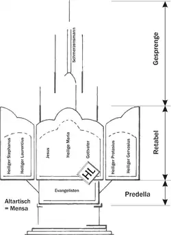 - ↑ Ausnahme bildet das Knie Christi, welches aus dem Rahmen hinausragt. Beim Schließen des Altars hätte es jedoch in der Lücke zwischen den beiden Figuren Stephanus und Laurentius Platz.