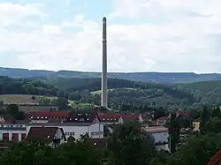 Der Schornstein, der mit einer Höhe von 204 Metern[6] zu den höchsten Bauwerken in Thüringen zählte, wurde mit dem Abbruch des Heizkraftwerkes am 6. August 2005 gesprengt.