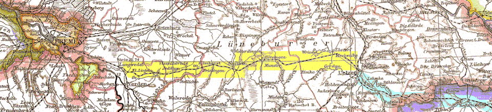 Farbige Markierung von Bahnstrecken (Nachbearbeitung): gelb = Anlagen der Bremer Staatsbahn, hellblau = Anlagen der Magdeburg-Halberstädter Eisenbahngesellschaft