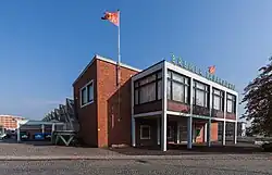 Vor der Halle steht mittig der zweigeschossige Büroanbau der Verwaltung mit einem Eingangsvorbau als Arkade.[2]