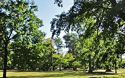 Der Pavillon mit dem Rosengarten, heute ein markanter Punkt des Parks, wurde 1931 nach Plänen von Eugen Kaufmann (1892–1984) als Teil des Projekts Neues Frankfurt errichtet.[4] Weitere bemerkenswerte Orte im Park sind das Kriegsopferdenkmal und das Denkmal für die 1938 zerstörte Rödelheimer Synagoge. Heute ist der Park mit seinem alten Baumbestand ein Erholungsort. Eine Besonderheit ist der etwa 260 Jahre alte Ginkgo-Baum, der auch „Goethe-Ginkgo“ genannt wird, weil ihn der Dichter Johann Wolfgang von Goethe besonders geschätzt haben soll.[5] Im Jahr 2007 wurde mit der Sanierung des Parks begonnen, bei der einige Bereiche umgestaltet wurden, um die ursprüngliche Bepflanzung und Wegführung wiederherzustellen. Im Park steht eine Stieleiche mit einem Brusthöhenumfang von 6,84 m (2015).[6] Nähere Informationen über die Baumbestände (Art und Pflanzdatum) gibt es online im Baumkataster Frankfurt.[7]