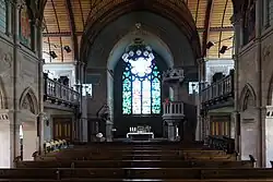 Das Chorfenster aus den 1950er Jahren stammt von Adolf Saile. Den Altar und das Lesepult gestaltete Gerhart Rieber.
