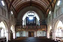 Im Kircheninnern befindet sich eine von Karl Donndorf geschaffene Büste des Namenspatrons. Die beiden chorseitigen Evangelistenbilder stammen von Hans von Kolb, die beiden durch Wasserschaden zerstörten im Kirchenschiff wurden von Sophie Schneider ersetzt.