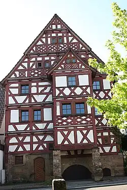 Das Handwerkerhaus steht mit dem Westgiebel zur Straße und hier befindet sich auch der Eingang zum gewölbten Keller, der bei der Straßenverbreiterung verändert wurde. Der erste niedrige Fachwerkstock wurde als Werkstatt und Lager genutzt. Der Eingang befindet sich links neben dem zweiflügeligen Rundbogentor des Kellers. Der Eingang zu den zwei Oberstöcken und den Dachstöcken befindet sich am östlichen Giebel. Im unteren Dachstock ist ein stehender und im oberen Dachstock ein liegender Kehlbalkendachstuhl. An der Westseite des Hauses steht über dem Kellereingang, der heute an die Hausfront zurückgezogen ist, ein dreistöckiger Erker mit Giebeldach und als Zierformen dienen Andreaskreuze. An den Eckständern sind der Fränkische Mann, ebenso Rauten und unter den Fensterbrüstungen Andreaskreuze zu sehen.