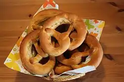 Die Brezel (in Bayern und Österreich die Breze) ist ein salziges oder selten auch süßes Gebäck in der Form eines symmetrisch verschlungenen Teigstrangs. Ihre Anfänge liegen im Mittelalter des deutschsprachigen Raums (Deutschland, Elsass, Österreich, Schweiz und Südtirol). Der Name Brezel wird von der etymologischen Forschung vom lateinischen brachium abgeleitet („der Arm“; mutmaßlich bezogen auf das Verschränken beider Unterarme vor dem Brustkorb).[1] Die Brezel ist das am weitesten verbreitete Gebildbrot oder Bildergebäck. Seit dem Mittelalter wird die Brezel von der Bäcker-Zunft als Zunftzeichen und heute als Wahrzeichen von den Bäcker-Innungen sowie den Bäckereien verwendet.[2] Im Laufe der Jahrhunderte bildeten sich zunehmend mehr Varianten der Brezel in immer mehr Regionen und Ländern aus. Am meisten verbreitet sind die bayerische Brezn[3] mit weitgehend gleicher Dicke und die schwäbische Brezel mit einem dicken Bauch und zwei dünnen Armen.