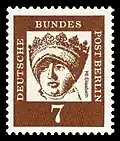 - Bild: Eine bearbeitete Abbildung der genannten Marke. Das Verhältnis der Größe der Briefmarken zueinander ist in diesem Artikel annähernd maßstabsgerecht dargestellt. Sollten keine Marken abgebildet sein, liegt es daran, dass das Urheberrecht des Künstlers noch nicht erloschen ist.