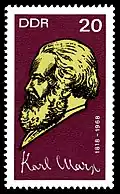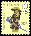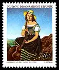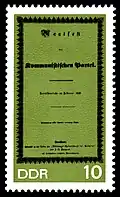 - Bild: Eine bearbeitete Abbildung der genannten Marke. Das Verhältnis der Größe der Briefmarken zueinander ist in diesem Artikel annähernd maßstabsgerecht dargestellt. Sollten keine Marken abgebildet sein, liegt es daran, dass das Urheberrecht des Künstlers noch nicht erloschen ist.
