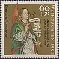 - Bild: Eine bearbeitete Abbildung der genannten Marke. Das Verhältnis der Größe der Briefmarken zueinander ist in diesem Artikel annähernd maßstabsgerecht dargestellt. Sollten keine Marken abgebildet sein, liegt es daran, dass das Urheberrecht des Künstlers noch nicht erloschen ist.