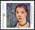 - Bild: Eine bearbeitete Abbildung der genannten Marke. Das Verhältnis der Größe der Briefmarken zueinander ist in diesem Artikel annähernd maßstabsgerecht dargestellt. Sollten keine Marken abgebildet sein, liegt es daran, dass das Urheberrecht des Künstlers noch nicht erloschen ist.