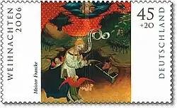 - Bild: Eine bearbeitete Abbildung der genannten Marke. Das Verhältnis der Größe der Briefmarken zueinander ist in diesem Artikel annähernd maßstabsgerecht dargestellt. Sollten keine Marken abgebildet sein, liegt es daran, dass das Urheberrecht des Künstlers noch nicht erloschen ist.