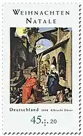 - Bild: Eine bearbeitete Abbildung der genannten Marke. Das Verhältnis der Größe der Briefmarken zueinander ist in diesem Artikel annähernd maßstabsgerecht dargestellt. Sollten keine Marken abgebildet sein, liegt es daran, dass das Urheberrecht des Künstlers noch nicht erloschen ist.