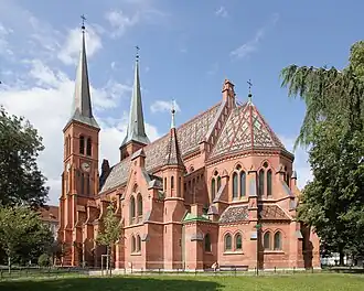 Die Kirche ist ein nach allen Seiten freistehender neugotischer Backsteinbau, mit Doppelturmfassade. Der Bau ist eine dreischiffige Anlage mit sechs Schiffsjochen in frühgotischen Formen. Das Bauwerk steht unter Denkmalschutz.[1]