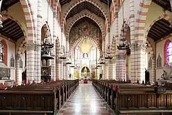 Das Langhaus der Kirche, das dreischiffig querschifflos und sechsjochig errichtet wurde, ist 60 m lang, 20,5 m breit und 19 m hoch.[2] Im Gegensatz zu anderen neugotischen Kirchen in Wien weist das Langhaus keine Kreuzgewölbe auf, sondern lediglich quer angeordnete Spitzbögen. Das Steildach des Langhauses und des Chores ist mit farbigen Ziegeln bedeckt.