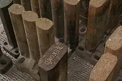 Bei Stangen- oder Strangpressen erfolgt die Verdichtung in der Regel in Kolbenstrangpressen. Das Material wird in einen zylindrischen oder eckigen Kanal eingeführt und über einen Kolben verdichtet, der mechanisch über ein Schwungrad oder über eine Hydraulik angetrieben wird. Beim Rückhub des Kolbens wird jeweils neues Material in den Presskanal zugeführt und während des Vorwärtshubes vom Kolben gegen das bereits im vorherigen Hub gepresste Material geschoben. Der Pressdruck entsteht durch die Wandreibung des gepressten Stranges im Presskanal als Gegendruck zum Kolbendruck und kann durch Verjüngung des Presskanals geregelt werden. Das gepresste Material tritt im Rhythmus der Kolbenschläge aus den Presskanal aus. Durch den Pressdruck, der bei Holzbriketts beispielsweise bis 1.200 bar beträgt, entstehen sehr hohe Temperaturen im Presslingsstrang, die insbesondere bei größeren Anlagen über eine Kühlung reduziert werden müssen.
