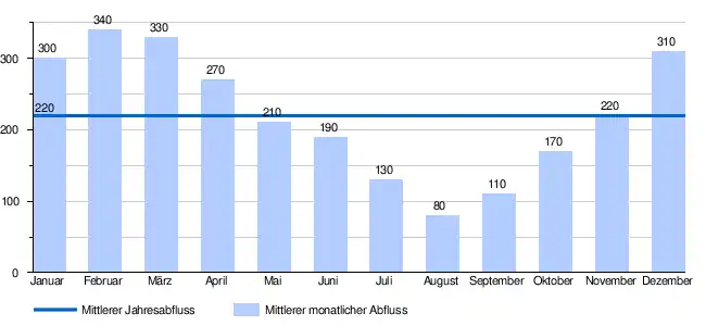 - ↑ a b Mittlere Abflüsse (m³/s) und Abflussregimetyp für das Gewässernetz der Schweiz (Bundesamt für Umwelt BAFU)