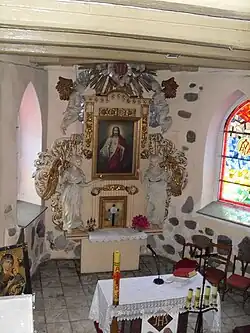 Die Dorfkirche stammt aus der zweiten Hälfte des 15. Jahrhunderts. Im Laufe seiner Geschichte wurde das Gotteshaus mehrfach restauriert, im Jahre 1866 erweitert und in den 1980er Jahren einer Grundüberholung ausgesetzt. Der markante Glockenturm aus Holz steht an der Westseite der Kirche. Neben dem Kanzelstuhl mit zwei lebensgroßen Engelstatuen und Barockschnitzereien gehört ein Taufstein in einer Form aus Zeiten der Renaissance zu den wertvollen Ausstattungen in den Kirchenräumen. Das Taufbecken trägt die Namen der Stifterfamilien Manteuffel und Blücher und ist heute nach erfolgter Restaurierung wieder zu besichtigen.