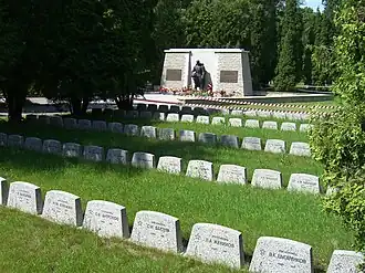 Unter dem Denkmal wurden im April 1945 nach offiziellen Angaben 13 Angehörige der Roten Armee neu beigesetzt, die zuvor an anderer Stelle begraben waren:
