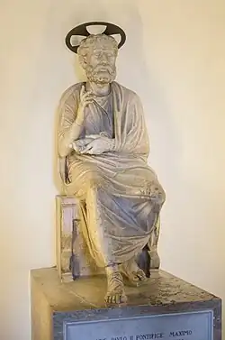 Von besonderer Bedeutung, auch für die Zuschreibung an Arnolfo di Cambio, ist die Ausformung des Kopfes und des Gesichtes Petri. Das Haupthaar und die Barthaare sind schneckenförmig eingedreht dargestellt.[3] Die Augen und die Ohren sind deutlich akzentuiert. Ein mögliches Vorbild für diese antikisierende Darstellung könnte eine antike Skulptur aus Marmor sein, die etwa im 3. Jahrhundert geschaffen wurde.[4] Sie stellt einen Rhetor oder Philosophen dar und wurde erst später zu einer Petrusdarstellung umgearbeitet, möglicherweise auch von Arnolfo di Cambio selbst.[4] Diese Skulptur befindet sich heute im Mittelgang der Grotte Vecchie in den Vatikanischen Grotten unterhalb des Petersdoms.