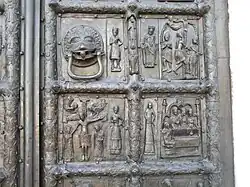 Zwischen den Platten mit figürlichen Motiven befinden sich breite Bordüren. Insgesamt besteht die Tür aus 24 quadratischen und 2 rechteckigen Bronzeplatten doppelter Breite (oben). Zwischen den Platten befanden sich Leisten mit Pflanzenornamenten, im oberen Teil durch figürliche Motive von Rittern und Bestien ersetzt.