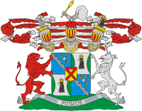Das Wappen (1798) ist geviert, in der Mitte ein Herzschild, in Gold das rote Andreaskreuz, aufliegend ein roter Balken (Stammwappen Clan Bruce); die Felder 1 und 4 zeigen in Blau einen silbernen Schräglinksbalken, darüber eine silberne Raute aus der drei Flammen hervortreten; die Felder 2 und 3 zeigen in Silber, die Seiten von einem grünen Bogen verengt, einen schwarzen goldgekrönten Adlerkopf; Drei Helme mit rot-silbernen Decken: links über einer Grafenkrone der goldgekrönte Adlerkopf; mitte ein silberner geharnischter Arm mit goldener Streitkeule; rechts über einer Baronkrone ein (...); Als Schildhalter links ein silbernes Einhorn, rechts ein roter Löwe; Wahlspruch FUIMUS Wir sind gewesen (Wahlspruch des Clan Bruce).
