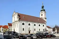 Im gleichen Jahr wurde auch mit dem Bau der barocken Kirche begonnen (Bau bis 1702; ein späterer Ausbau ging erst 1738 zu Ende). Der heutige Kirchturm war früher ein einfacher Stadtturm, welcher dazu benutzt wurde, um vor sich nähernden Feinden, Feuer innerhalb der Stadt oder anderen Gefahren zu warnen. Die Burg im Norden der Stadt ließ Aloys Thomas Graf Harrach von 1707 bis 1711 von Johann Lukas von Hildebrandt zu dem auch heute noch benutzten barocken Schloss Prugg ausbauen.