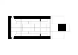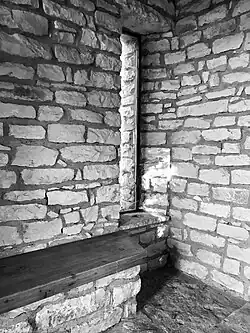 Wände, Bänke und Boden bestehen aus Jurakalk. Die Bänke sind mit Holzplatten versehen. Der Dachstuhl ist aus Holz erstellt. Auch für die Dacheindeckung wurden Jurakalkplatten verwendet. Zwei schmale und hohe Fensterbänder im Norden geben dem Sakralraum sein natürliches Licht.[4]