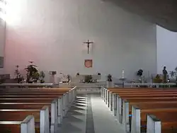 Der Chorraum der Kirche ist schlicht gehalten. Neben dem Altar steht lediglich der Tabernakel; an der grossen Rückwand befindet sich ein kleines Kreuz; darunter in einer Nische, die ursprünglich für die Aussetzung der Monstranz gedacht war, eine Abstraktion des Rades von Bruder Klaus.