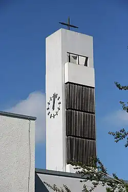 Die Kirche Bruder Klaus befindet sich im Ortszentrum an der Ecke Wiesen- und Hilagstrasse. Der frei stehende Kirchturm besitzt schlicht gestaltete Turmseiten aus Sichtbeton. Auf drei Seiten ist eine Turmuhr angebracht, zwei Seiten besitzen die Schallöffnungen der Glockenstube. Diese sind mit Holzlamellen verkleidet, deren Dreizahl auf die Trinität verweist. Die vier Glocken wurden von Emil Eschmann 1963 gegossen und erklingen in der Tonfolge es, g, b, c.[2] Aussen wie innen ist die Kirche in gemässigt modernem, sachlich-nüchternem Stil gestaltet. Über eine Freitreppe gelangt der Besucher zum Kirchenportal. Auf dem hellen Holz der Türen ist das Christus-Wort zu lesen: «Ich bin die Tür. Wer durch mich hineingeht, wird gerettet werden.» Über der Inschrift ist ein stilisiertes Kreuz dargestellt. Links vom Portal ist der Grundstein angebracht, auf dem das Bruder-Klaus-Rad gezeigt wird.[3]