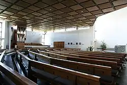 Der Kirchenraum besitzt einen rechteckigen Grundriss, an den auf der südöstlichen Seite der Altarraum mit gerundeter Chorwand angebaut wurde. Der Altarraum ist durch vier Stufen vom Kirchenraum abgehoben. Durch den Mittelgang schreitet der Besucher direkt auf den Altar und den an der Chorwand dahinter angebrachten Tabernakel zu. Oberhalb des Tabernakels ist ein Kruzifix mit Corpus angebracht.