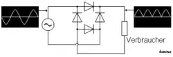 Wenn eine Wechselspannung mit Dioden gleichgerichtet wird, entsteht in der Mitte jeder halben Periode eine Spannungsspitze, die wieder auf Null abfällt (1. Abbildung rechts). Dieses Abfallen kann mit einem Kondensator verzögert, aber nicht verhindert werden. Somit entsteht in jeder halben Periode eine Differenz zwischen der Spitzenspannung und dem tiefsten Punkt der Kondensatorspannung vor dem Wiederanstieg (2. Abbildung). Diese so entstandene Spannungsdifferenz bezeichnet man als Restwelligkeitsspannung. Sie kann mit einem „gekoppelten TRUE-RMS-Messgerät“ (Effektivwert) gemessen werden.