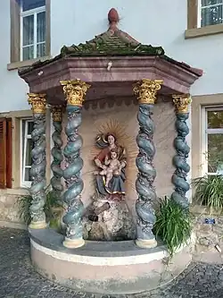 Der Wandbrunnen mit barockem ehemaligem Altarbaldachin vom Anfang des 18. Jahrhunderts besteht aus fünf gedrehten Säulen und einem fünfeckigen Zeltdach, das von einer Zirbelnuss bekrönt wird. Über dem Wasserausguss sitzt auf einem Stein eine Muttergottes mit Kind.