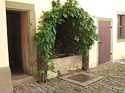Ein Brunnen befindet sich im Hof, in der Kutschendurchfahrt, von Goethes Wohnhaus. Dieser ist nischenartig in die Hauswand eingefügt, ausgemauert mit Tuffsteinen, ähnlich einer Grotte. Er dürfte eher praktischen Zwecken gedient haben. Dafür spricht das darin befindliche große quaderförmige Brunnenbecken.[1] Dieser Brunnen ist an eine Röhrenfahrt angeschlossen. Um die Wirkung zu erhöhen, ist sie von Wildem Wein umrahmt.