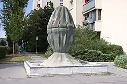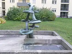 Eiförmige Bronzeplastik in Kunststeinbrunnenschale | Wander Bertoni | 1969 | Vor der Wohnhausanlage, ursprünglich als Teil einer größeren Anlage geplant | |