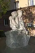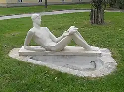 Zwei steinerne menschliche Figuren in einem Brunnenbassin | Hannes Haslecker | 1957 | Am Bauwich der 1955–1957 errichteten Wohnhausanlage |