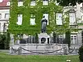 Brunnen mit Steinfigur und eiserner Schlangenskulptur | Edmund Hellmer | 1910 | Im Innenhof der Universität. Die Figur der Nymphe Kastalia sitzt auf einem Thron, um den sich ihr Vater Acheloos in Gestalt einer Schlange windet. Auf der Rückseite des Sitzes befindet sich das Relief eines eine Schlange bezwingenden Mannes.[11] |