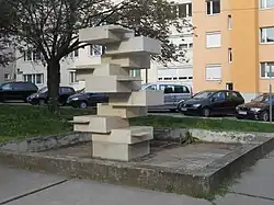 Brunnenskulptur aus Lindabrunner Konglomerat | Mathias Hietz | 1978 | Im zentralen Innenhof des Josef-Bohmann-Hofes. | |