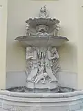 Wandbrunnen mit Relief und Becken aus Wöllersdorfer Stein | Georg Raphael Donner | 1741 | Perseus und Andromeda darstellendes Relief; die seitlichen Atlanten-Pfeiler tragen den darüber liegenden Balkon. |