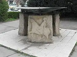Brunnen mit Steinskulptur | Rudolf Schmidt | 1937 | Die Skulptur stellt zwei Männer dar, die eine dritte – offenbar verletzte – Person tragen. Diese Darstellung und der Name des Brunnens bezieht sich auf die Sage über den sogenannten Hannakenkönig. |