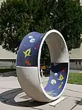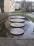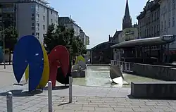 Brunnen mit Stahlskulpturen | Waltrud Viehböck | 1995 | Zwei separate Brunnenbecken, eines davon mit angrenzendem Pavillon. In und neben den Becken sind die Stahlskulpturen Neun Doppel-Ellipsen installiert. Mit der Umgestaltung der Wasserwelt 2017 weggefallen. |