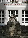 Steinbrunnen mit mosaizierter Schale, der von sechs Affenfiguren und einer Schildkrötenfigur flankiert wird. | Hubert Wilfan | 1953 | Auf dem Gelände des Julius-Deutsch-Hofes | |