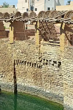 Der Brunnen hat einen Durchmesser von 18 Metern und verfügt über mehr als 40 Brunnenräder, die rings um den Brunnen angeordnet sind. Über diese Räder wurde das Wasser – es sieht heutzutage sehr grün aus – per Flaschenzug in einem Eimer aus etwa 13 Metern Tiefe durch Zugtiere, meist Kamele, nach oben befördert und über Kanäle weitergeleitet. Jedes Tier hatte seinen eigenen Strang.[6] Flaschenzüge und Kanäle sind noch zu sehen; die Wasseranlage versorgt jedoch heute die umliegenden Brunnen und Felder durch moderne Wasserpumpensysteme mit Wasser.[7]