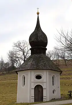 Der achteckige Bau mit schindelgedecktem Zeltdach und Laterne mit Zwiebelhaube hat eine ebenfalls denkmalgeschützte Ausstattung.